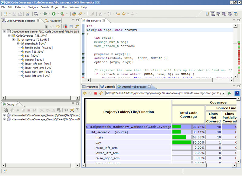 The QNX® Momentics® Tool Suite includes an integrated code coverage tool that developers can use to identify code that did not run during testing. It also allows them to either modify the test suite to run the code or remove the code if no longer needed. The code coverage tool is ideal for: