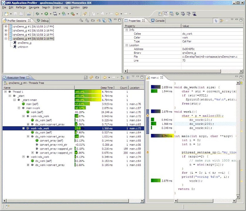 With the QNX® Momentics® Tool Suite application profiler, developers can examine the overall performance of programs, no matter how large or complex, without following the source one line at a time. They can quickly target areas of highly used code for debugging, performance analysis, and optimization.