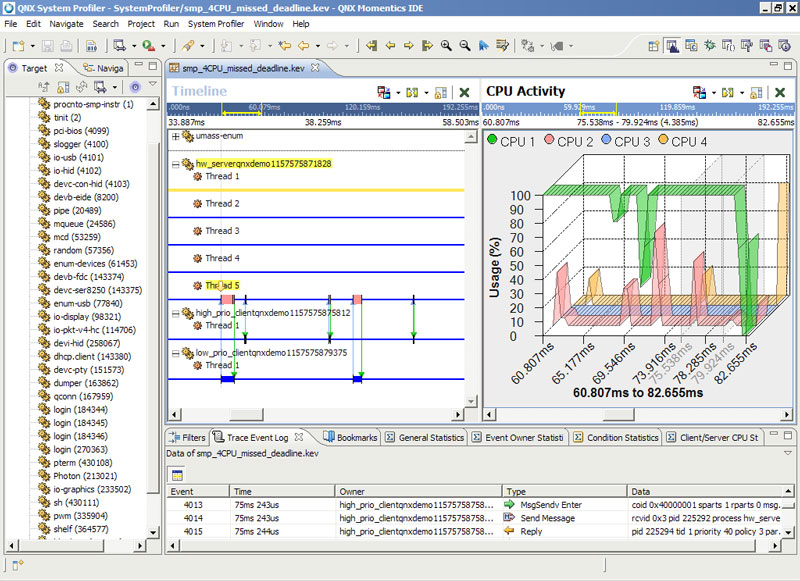 The QNX® Momentics® Tool Suite system profiler works in concert with the instrumented kernel to provide insight into the operating system's events and activities. Like the application profiler, the system profiler can help pinpoint areas that need improvement at a system-wide level:
